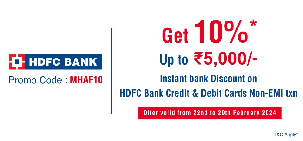 - Instant Discount of 10% (upto Rs.5000) applicable on HDFC Credit cards.