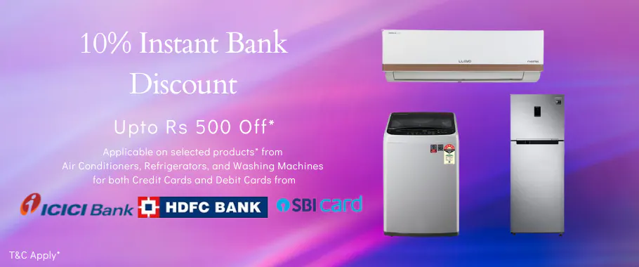 - The offer is valid exclusively on designated appliance products sold by Reliance Retail. Customers are advised to check the offer section on the product page to ascertain the applicability of the offer, and to refer to the checkout page and payment page to determine the final bank instant discount amount applied.