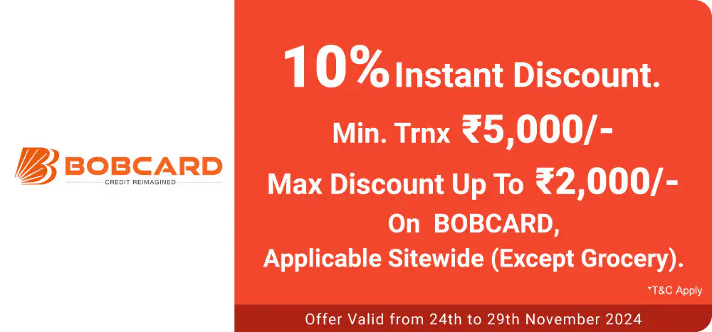 10% Inst Dis Min Trnx 5000/- Max Dis Up to Rs. 2000/- On BOBCARD, App Sitewide Except Groc