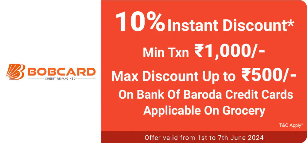 10% Instant Discount. Min. Trnx 1,000/- Max Discount Up to Rs. 500/- On BOB Credit Cards. Applicable On Grocery