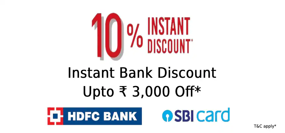 - Instant Discount of 10% (upto Rs.3000) applicable on SBI Credit cards and Debit Cards EMI and Non EMI Transactions.