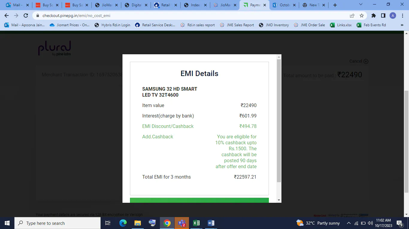 - While Selecting EMI Plan, Check EMI Details and the Cashback details would be reflecting.