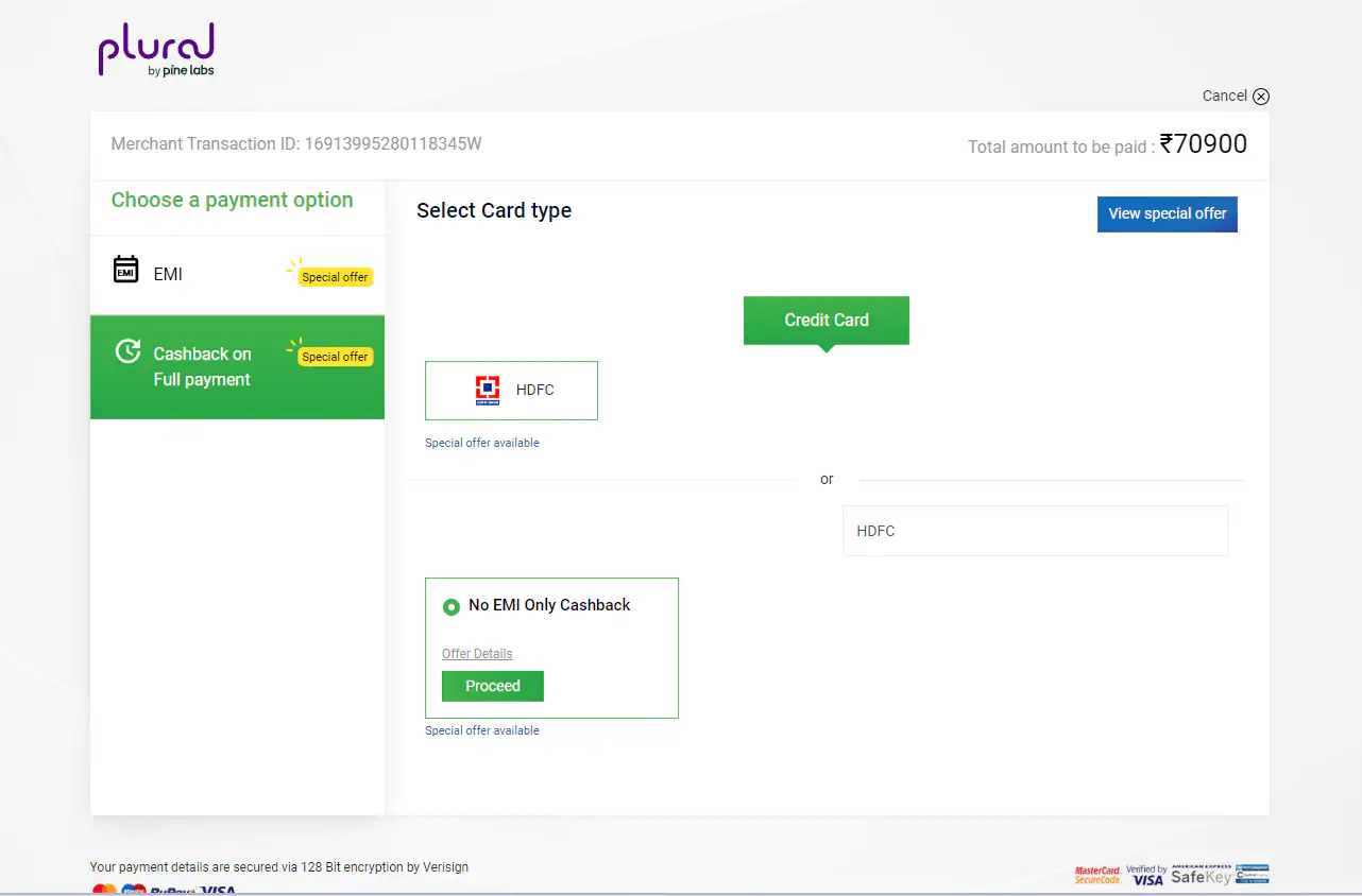 - After selecting “Bank Offers” on Payment Page user will be redirected to below screen wherein the user can choose the respective bank card and the payment option i.e. Cashback on Full Payment / EMI.