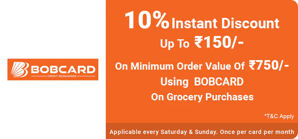 10% Int Dis. upto Rs150/- on min order value of Rs750 on BOBCARD on Gry pur. Appl every sat & sun. Once per card per mnt Coupon Code