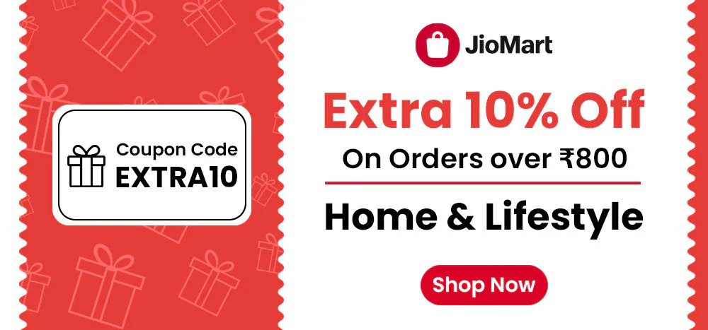 The Discount of 10% extra off, with a maximum Rs. 200.00 (Rupees Two Hundred Only) can be availed on a purchase of Eligible Products sold by Reliance with minimum cart value of Rs. 800.00 (Rupees Five Hundred Only); The Discount Coupon is redeemable only against purchase of Eligible Products on JioMart; i.e. The Offer shall be valid on selective products under Home & Lifestyle, Industrial & Professional Supplies sold by Reliance on JioMart. This does not include any third-party seller product and any other item or product that may be identified by Reliance from time to time.