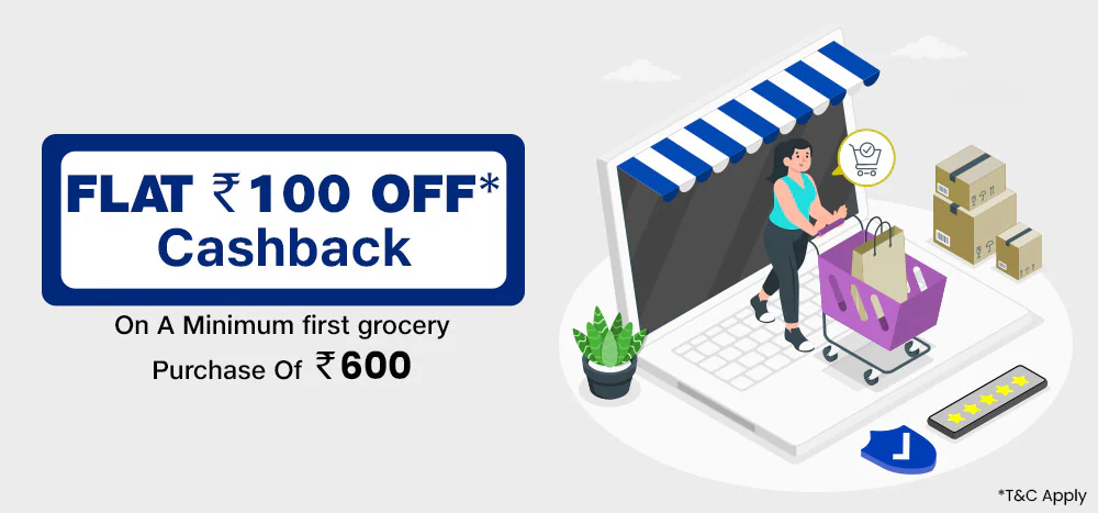 - Upon purchase of Eligible Products (defined below) sold by Reliance with minimum cart value of Rs.600.00 (Rupees Six Hundred Only) of Grocery products the User shall be eligible to get a cashback of 100 (Rupees One Hundred Only); cashback to be credited in 7 working days.
