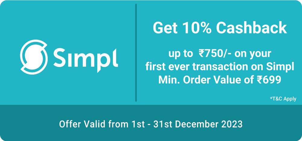 Get 10% cashback upto ₹750 on your first ever transaction on Simpl.Min. Order Value of Rs 699