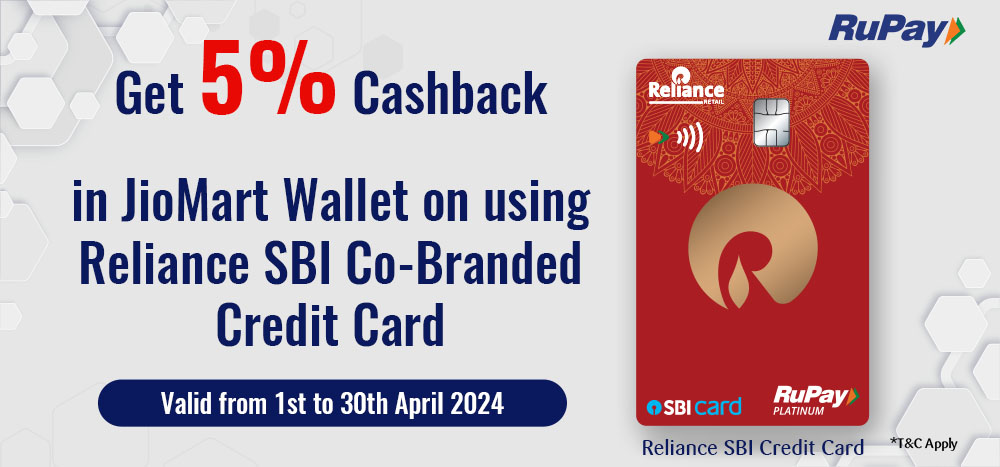 Get 5% Cashback in JioMart Wallet on using Reliance SBI Co-Branded Credit Card.T&C Apply.