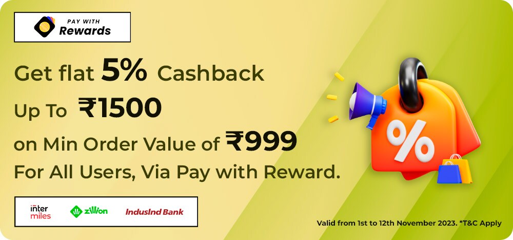 Get flat 5% cashback up to ₹1500 cashback on Minimum order value 999 for all users, via Pay with Rewards. T&C Apply