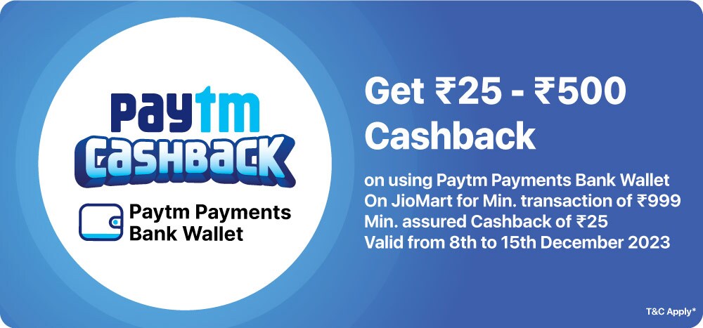 Use Paytm on www.jiomart.com/JioMart App for a minimum purchase amount of Rs. 999.00 and get up to Rs 25-500 cashback using Paytm Payments Bank Wallet. Valid for all Users (1 time per user during the campaign validity), Minimum assured cashback Rs 25. This Offer is not applicable in Tamil Nadu and Puducherry.
