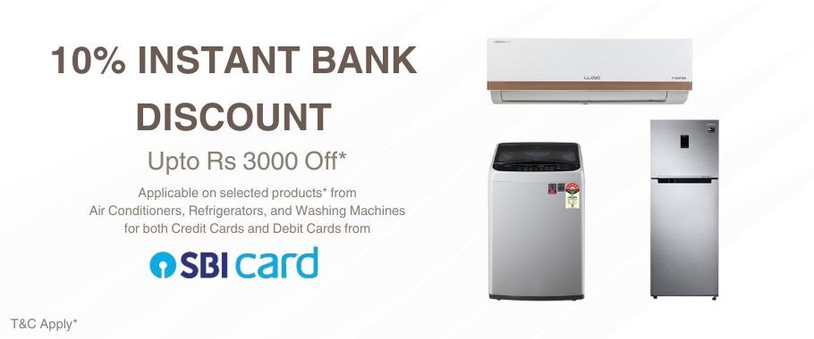 SBI Bank offers on selected products* in Air Conditioners, Refrigerators, and Washing Machines for Credit Cards Transactions.