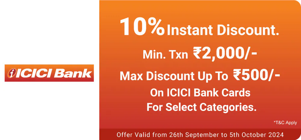 - Under this Offer, cardholder can avail 10% Instant Discount with ICICI Bank Cards & EMI.