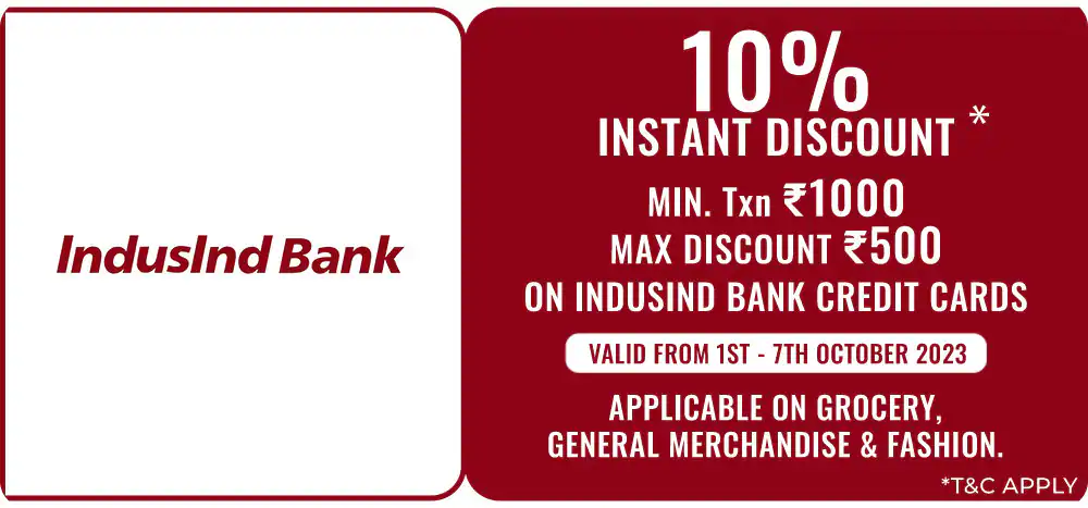 IndusInd Bank Credit Cards - 10% Instant Discount. Min. Trnx 1000/- Max Discount Up to Rs. 500/- On IndusInd Bank Credit Cards. Applicable On Grocery, General Merchandise & Fashion. T&C Apply