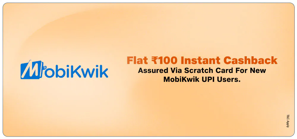 Flat Rs 100 Instant Cashback assured via Scratch Card for New MobiKwik UPI users. Coupon Code