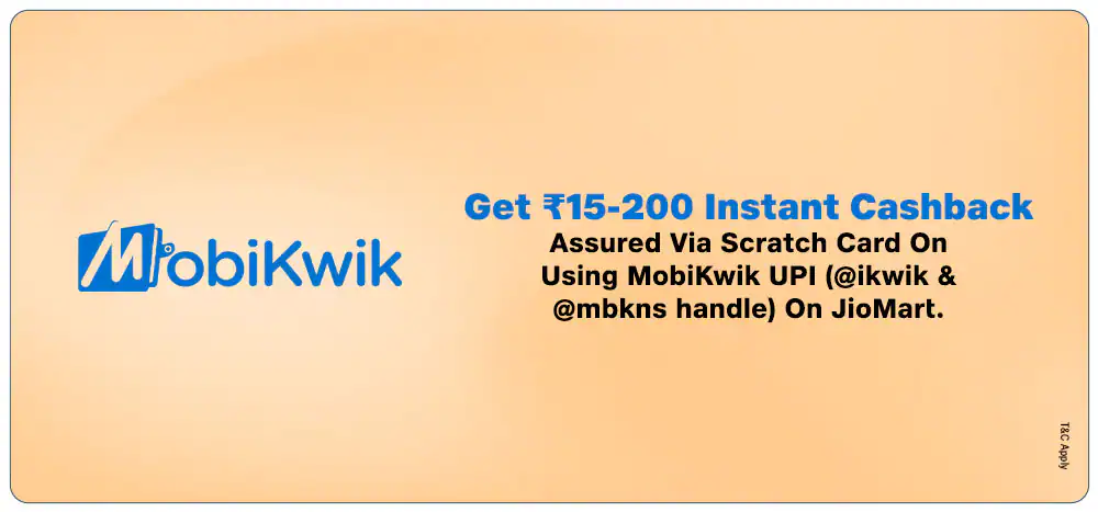 Get upto Rs 15-200 Instant Cashback assured via Scratch Card on using MobiKwik UPI (@ikwik handle) on JioMart. T&C Apply