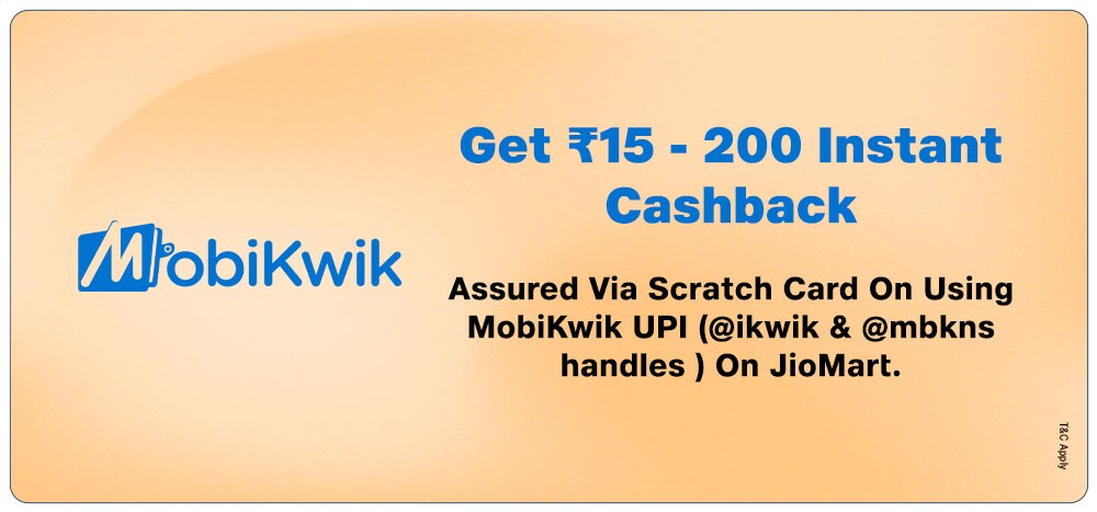 Get Rs 15 - 200 Instant Cashback assured via Scratch Card on using MobiKwik UPI (@ikwik & @mbkns handles ) on JioMart. Coupon Code