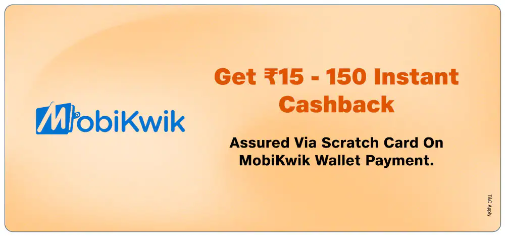 Get Rs 15- 150 instant cashback assured via Scratch Card on MobiKwik wallet payment. T&C Apply