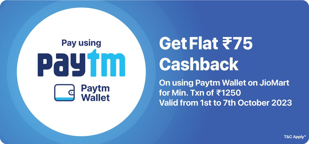 Use Paytm on www.jiomart.com/JioMart App for a minimum purchase amount of Rs. 1250.00 and get Rs 75 cashback using Paytm Wallet. Valid for all Users (1 time per user during the campaign validity), Minimum assured cashback Rs 75. This Offer is not applicable in Tamil Nadu and Puducherry.