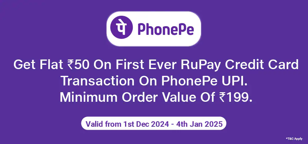 New User Offer: Win Flat Rs 50 cashback on first Rupay credit card transactions via PhonePe UPI.