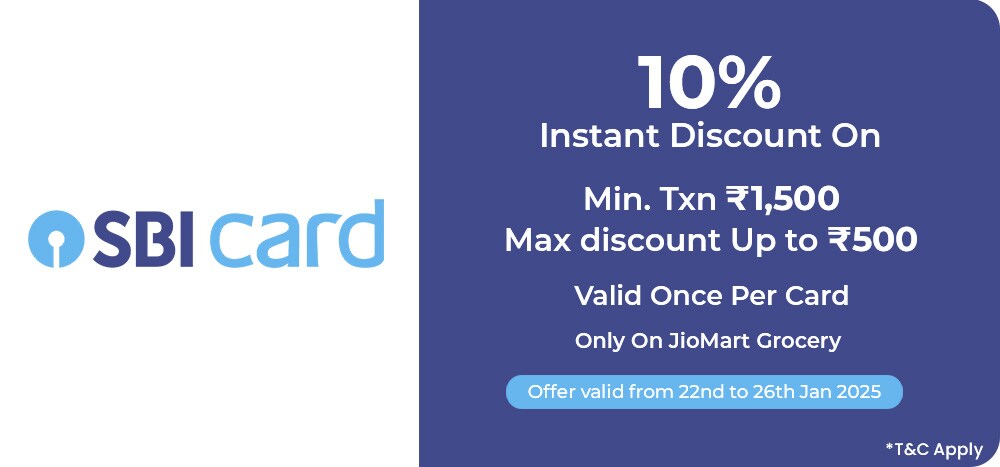 SBI Credit Card Jan 2025 - 10% Instant Discount on Min. Txn of Rs. 1500. Max Discount Up to Rs. 500/- Valid Once per card. Only on JioMart Grocery