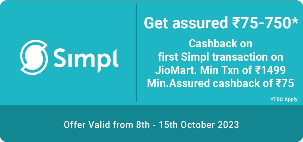 Simpl - Get assured Rs 75-750* Cashback on first Simpl transaction on JioMart. Min Txn of Rs 1499. Min.Assured cashback of Rs 75. T&C Apply.