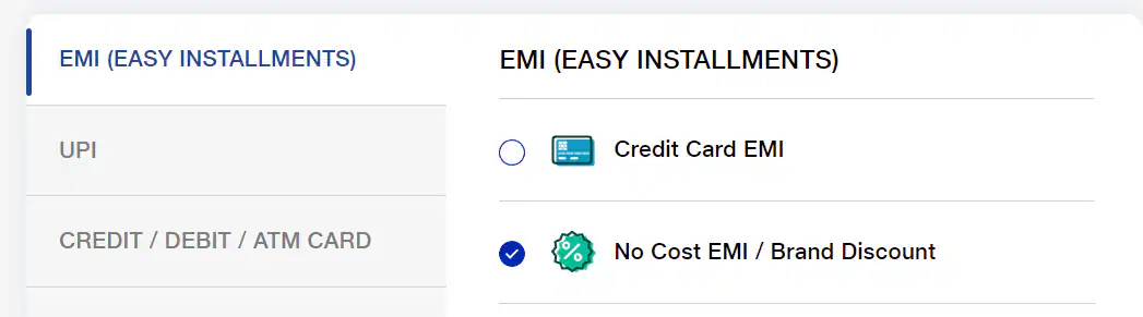 - To avail the offer click on “EMI (Easy Instalments)” on the payment page and Choose Brand Discount