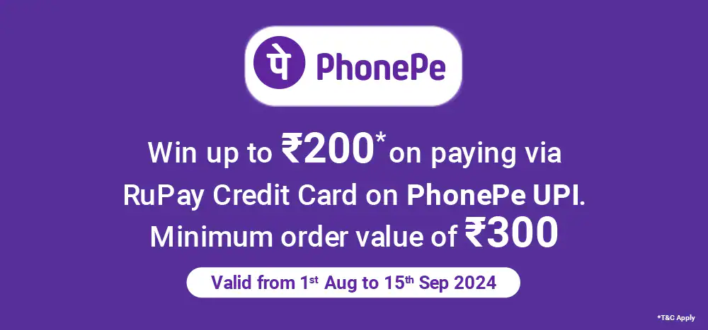 Win up to Rs.200* on paying with RuPay Credit Card via PhonePe UPI. Minimum order value of Rs.300.