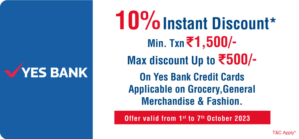 Yes Bank Credit Cards - 10% Instant Discount. Min. Trnx 1500/- Max Discount Up to Rs. 500/- On Yes Bank Credit Cards. Applicable On Grocery, General Merchandise & Fashion. T&C Apply