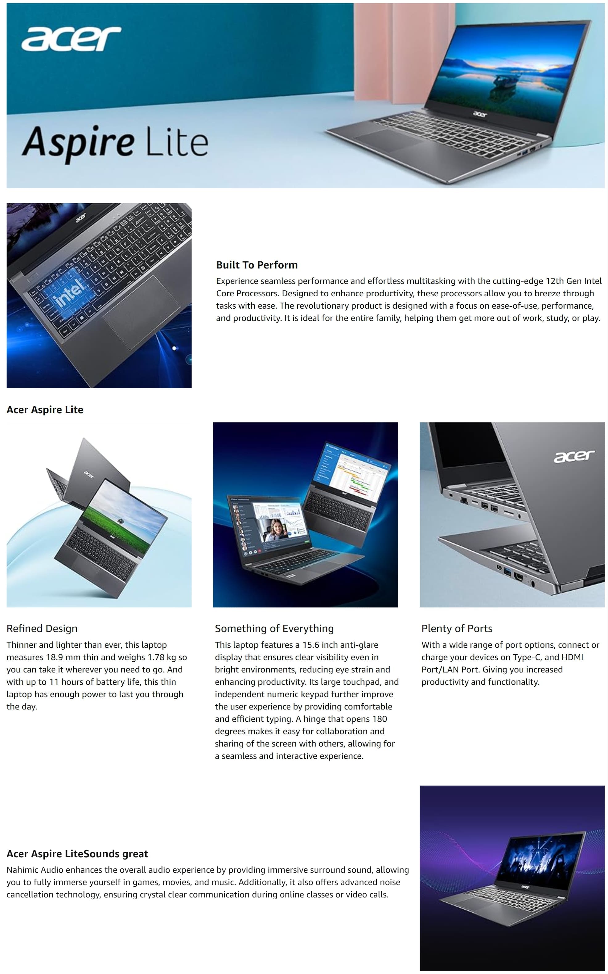 Device Protection Plan AddedAcer Aspire Lite AL15-52 Standard Laptop (Intel Core i3-1215U processor/DDR4 8GB/512 GB /Intel UHD Graphics/Windows 11 Home/Office Home and Student 2021/Full HD), 39.62 cm (15.6 inch), Steel Grey