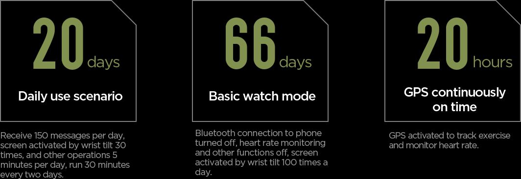 | Battery Run Time | Upto 20 Days (Daily Use Scenario) Upto 66 Days (Basic Watch Mode) Upto 20 hours (GPS Continuosly On Time) |