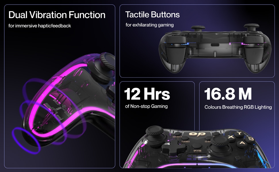 | Key Features | 2.4 GHz Wireless Connectivity 12 Hours Non-Stop Gaming RGB Light, Turbo Mode Dual Vibration Function Wide Compatibility Type-C Charging |
