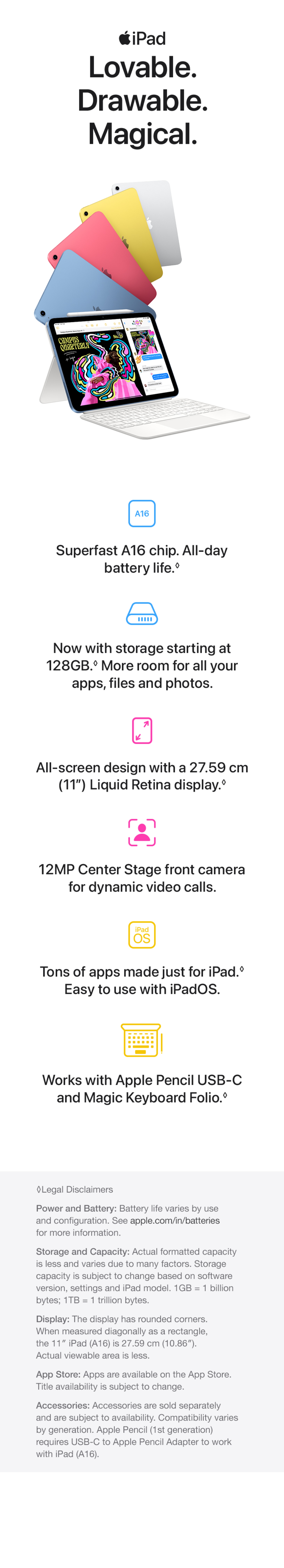 | Key Features | Camera: 12 MP Wide camera, ƒ/1.8 aperture Display: Liquid Retina display Resolution: 2360 x 1640-pixel at 264 ppi Brightness: 500 nits Supports: Apple Pencil (USB-C) LED backlit Multi‑Touch display with IPS technology Fingerprint-resistant oleophobic coating |