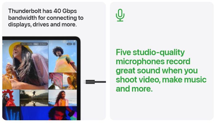 For powerful creative workflows. Now with Thunderbolt, this is the fastest, most versatile port ever on iPad. It works with existing USB‑C connectors and opens up an extensive ecosystem of high‑performance accessories for iPad Pro - like fast external storage, displays and docks. Transfer huge assets or even drive the Pro Display XDR at full 6K resolution.
