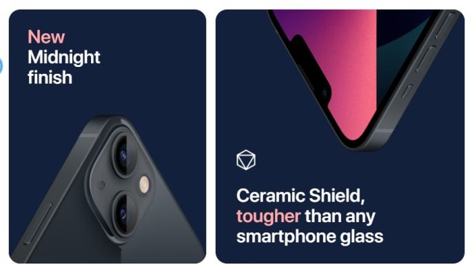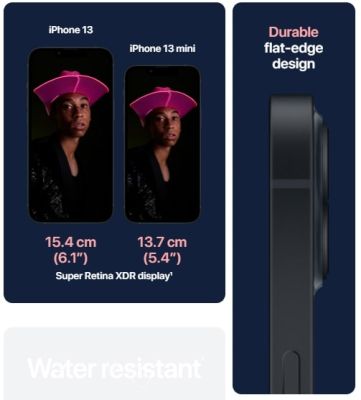 | Key Features | Super Retina XDR Display 5G Enabled Phone A15 Bionic Chip 13.7 cm (5.4 inch) all‑screen OLED Display Dual 12 MP Camera System: Ultra Wide and Wide Cameras Fingerprint-resistant Oleophobic Coating Rated IP68 Splash, Water and Dust Resistant Face ID Enabled by TrueDepth Camera for Facial Recognition Built-in Rechargeable Lithium-ion Battery MagSafe wireless charging up to 15W Qi wireless charging up to 7.5W |