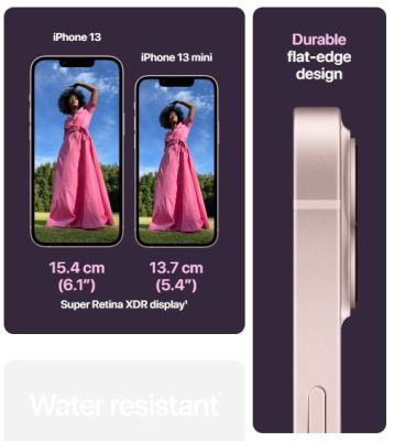 | Key Features | Super Retina XDR Display 5G Enabled Phone A15 Bionic Chip 13.7 cm (5.4 inch) all‑screen OLED Display Dual 12 MP Camera System: Ultra Wide and Wide Cameras Fingerprint-resistant Oleophobic Coating Rated IP68 Splash, Water and Dust Resistant Face ID Enabled by TrueDepth Camera for Facial Recognition Built-in Rechargeable Lithium-ion Battery MagSafe wireless charging up to 15W Qi wireless charging up to 7.5W |