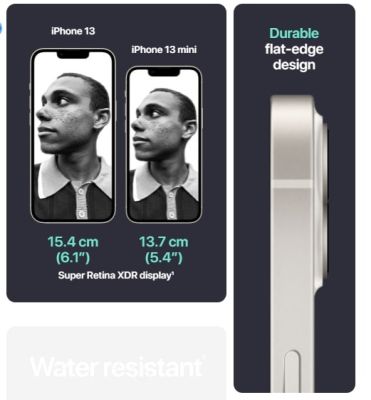 | Key Features | Super Retina XDR Display 5G Enabled Phone A15 Bionic Chip 13.7 cm (5.4 inch) all‑screen OLED Display Dual 12 MP Camera System: Ultra Wide and Wide Cameras Fingerprint-resistant Oleophobic Coating Rated IP68 Splash, Water and Dust Resistant Face ID Enabled by TrueDepth Camera for Facial Recognition Built-in Rechargeable Lithium-ion Battery MagSafe wireless charging up to 15W Qi wireless charging up to 7.5W |