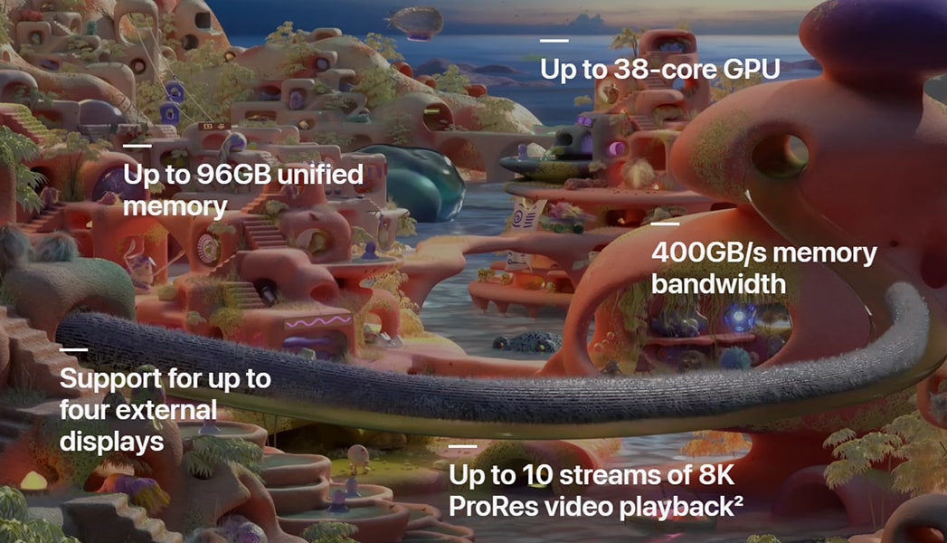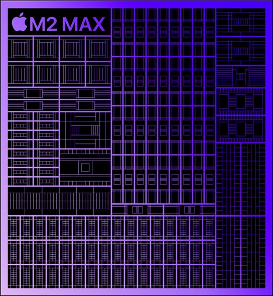 The most powerful and efficient chip ever in a pro laptop, M2 Max is engineered to help pros push the boundaries of their ingenuity and creativity. With the same next‑generation 12‑core CPU as M2 Pro, M2 Max has twice the memory bandwidth, up to three times the unified memory and up to 38 GPU cores. So you can render effects, merge massive panoramas and design extreme 3D geometry on an unprecedented scale.