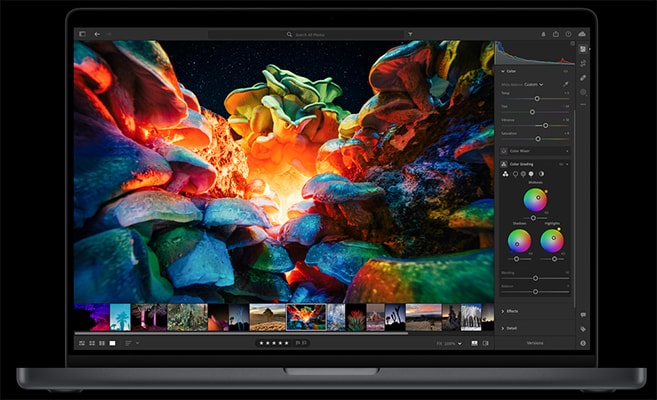 Liquid Retina XDR. Extreme Dynamic Range brings refined specular highlights, incredible detail in shadows, and vibrant, true‑to‑life colours. Each display is calibrated in the factory and features pro reference modes for HDR colour grading, photography, design and print production.