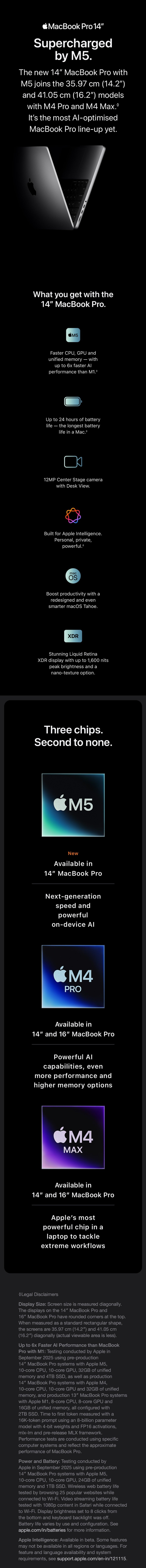 | Key Features | Processor: Apple M5 Chip/10C CPU/10C GPURAM: 16 GBInternal Storage: 1 TBStorage Type: SSDOperating system: MacOS35.56 cm (14 inch) Liquid Retina XDR Display |