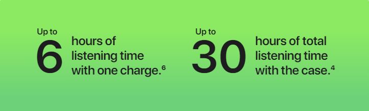 - With up to 30 hours of listening time, these Apple earbuds guarantee that your music never skips a beat. These earphones will therefore keep you comfortable whether you're working out, traveling, or just lounging around the house.