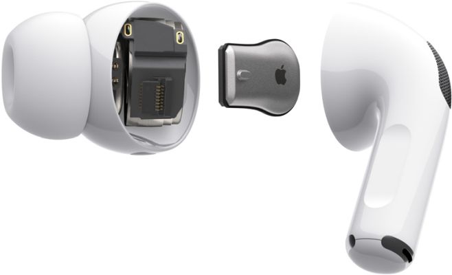 Tech-packed yet compact, AirPods Pro are built around our System in Package design - featuring the H1 chip that powers everything from sound to Siri.