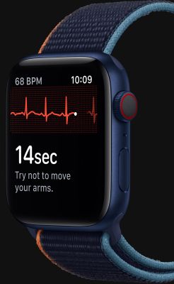 Electrodes built into the Digital Crown and the back crystal work together with the ECG app to read your heart’s electrical signals. Simply touch the Digital Crown to generate an ECG waveform in just 30 seconds. The ECG app can indicate whether your heart rhythm shows signs of atrial fibrillation — a serious form of irregular heart rhythm — or sinus rhythm, which means your heart is beating in a normal pattern.