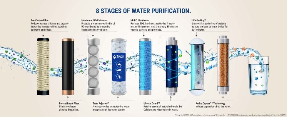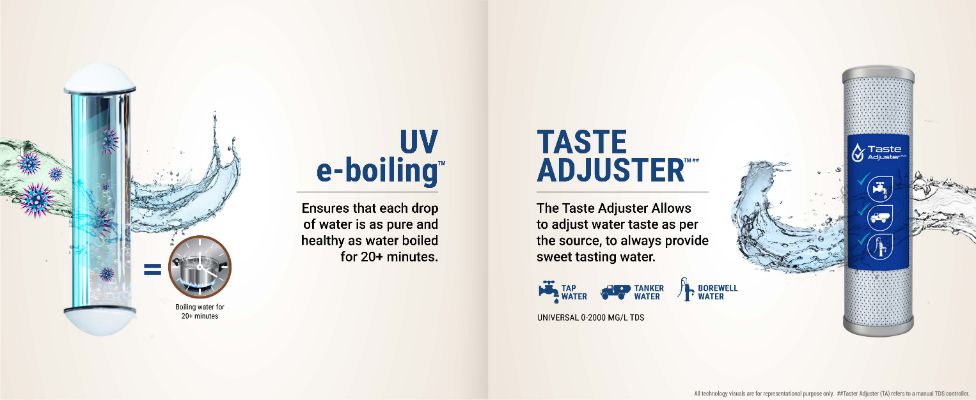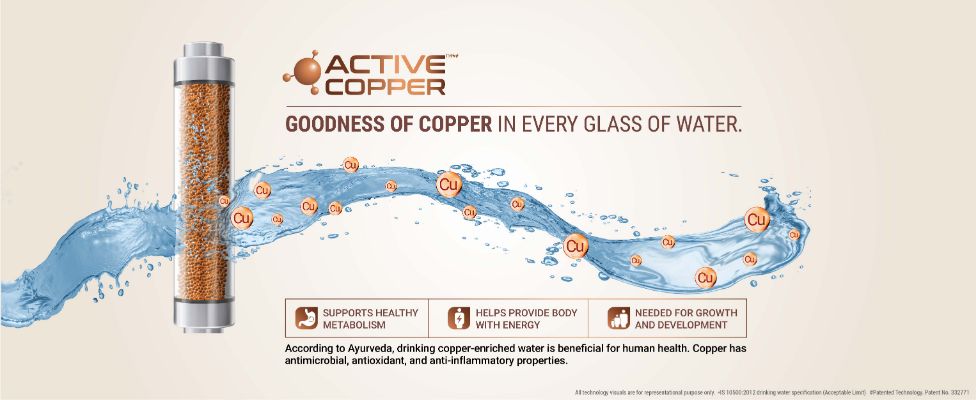 | Key Features | Active Copper Technology Superior HD RO, UV E-boiling Advanced Taste Adjuster (MTDS) High Flow RO Membrane, UV Lamp Active Copper Cartridge i-Filter, Mineral Guard, Chemi block, Membrane life enhancer |