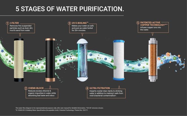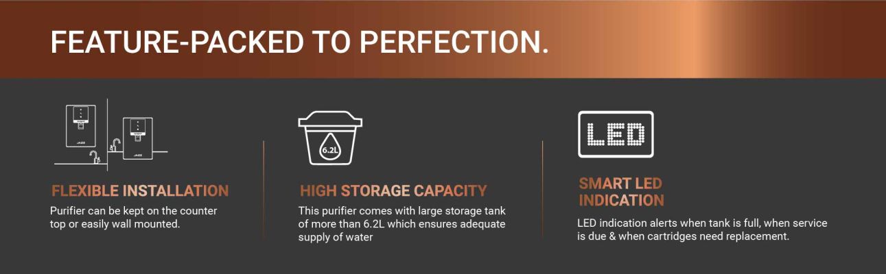 | Key Features | 5 Stages of Purification Active Copper Technology UV e-Boiling and Ultra-Filteration 6.2 L Storage Capacity |