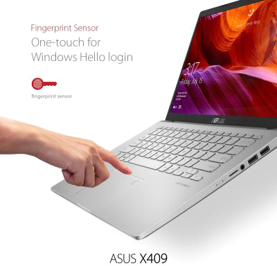 Accessing ASUS X409 has never been easier and more secure With the built-in fingerprint sensor in the touchpad and Windows Hello, there's no need to type in your password every time all you need is a single touch