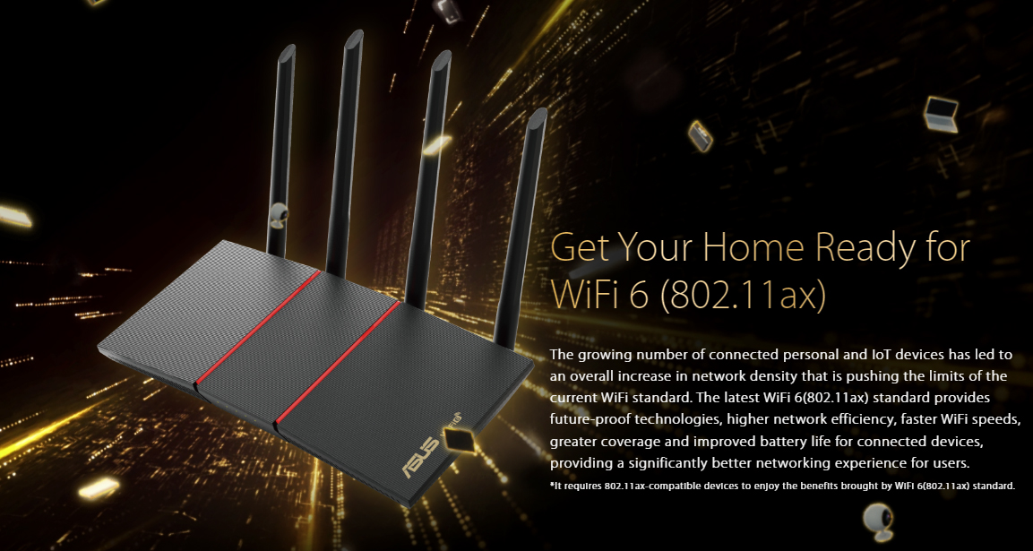 AX1800 Dual Band WiFi 6 (802.11ax) Router supporting MU- MIMO and OFDMA technology, with AiProtection Classic network security powered by Trend Micro, compatible with ASUS AiMesh WiFi system
