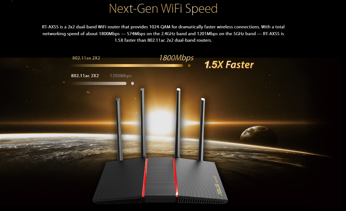 • Ultra-fast WiFi Speed – RT-AX55 supports 1024-QAM for dramatically faster wireless connections. With a total networking speed of about 1800Mbps — 574 Mbps on the 2.4GHz band and 1201 Mbps on the 5GHz band.