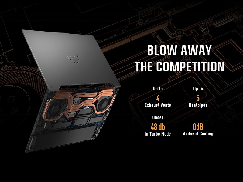 The TUF Gaming A15 is equipped to handle its high-power CPU with a pair of 84-blade Arc Flow Fans. Our new variable thickness design has the dual benefit of increasing pressure while reducing turbulence, improving cooling performance without extra noise. When paired with up to four exhaust vents and five dedicated heatpipes, the TUF Gaming A15 keeps its cool in even the most demanding games.