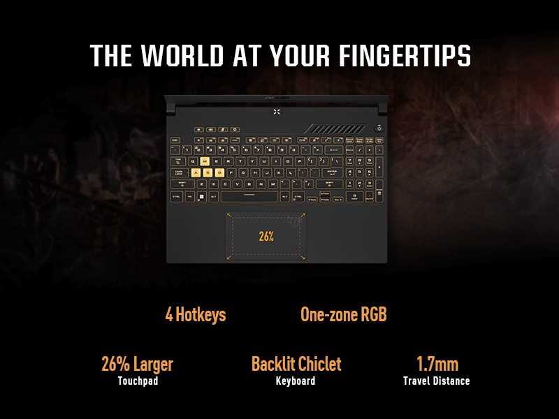Arm yourself with a desktop-style keyboard optimized for gaming. Uniform RGB backlighting lets you express your own unique style, while highlighted WASD accents give you a visual shortcut to key movement commands. Overstroke technology triggers higher in each keystroke for faster responsiveness and effortless control. A 26% larger touchpad makes sure you’re always in control.