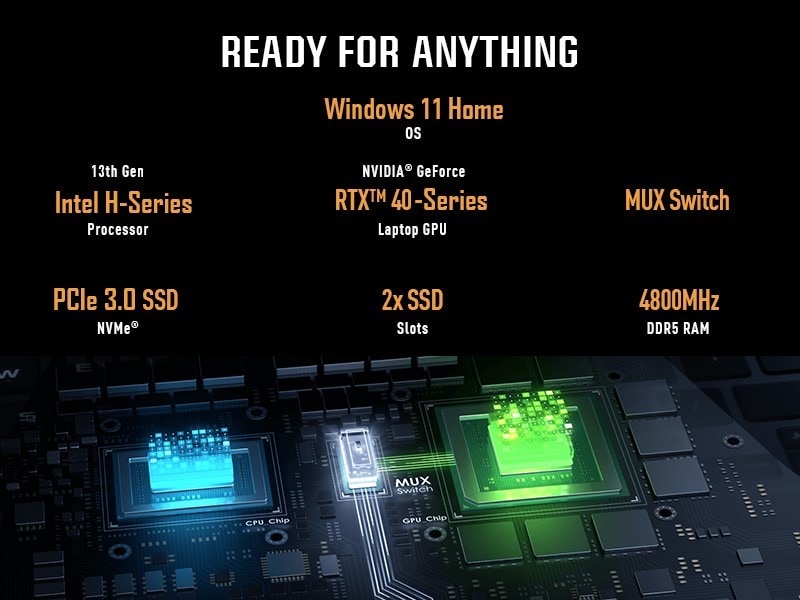 Jump right into the action with the TUF Gaming A15. Stream and multitask with ease thanks to the Latest AMD Ryzen 7000-HS Series Processor and blisteringly fast 4800MHz DDR5 RAM on Windows 11. Leverage the full gaming performance of the GeForce RTX 40-Series Laptop GPU with a dedicated MUX Switch. When your game library gets full, an empty M.2 NVMe PCIe Gen 4x4 SSD slot makes upgrading storage capacity a breeze